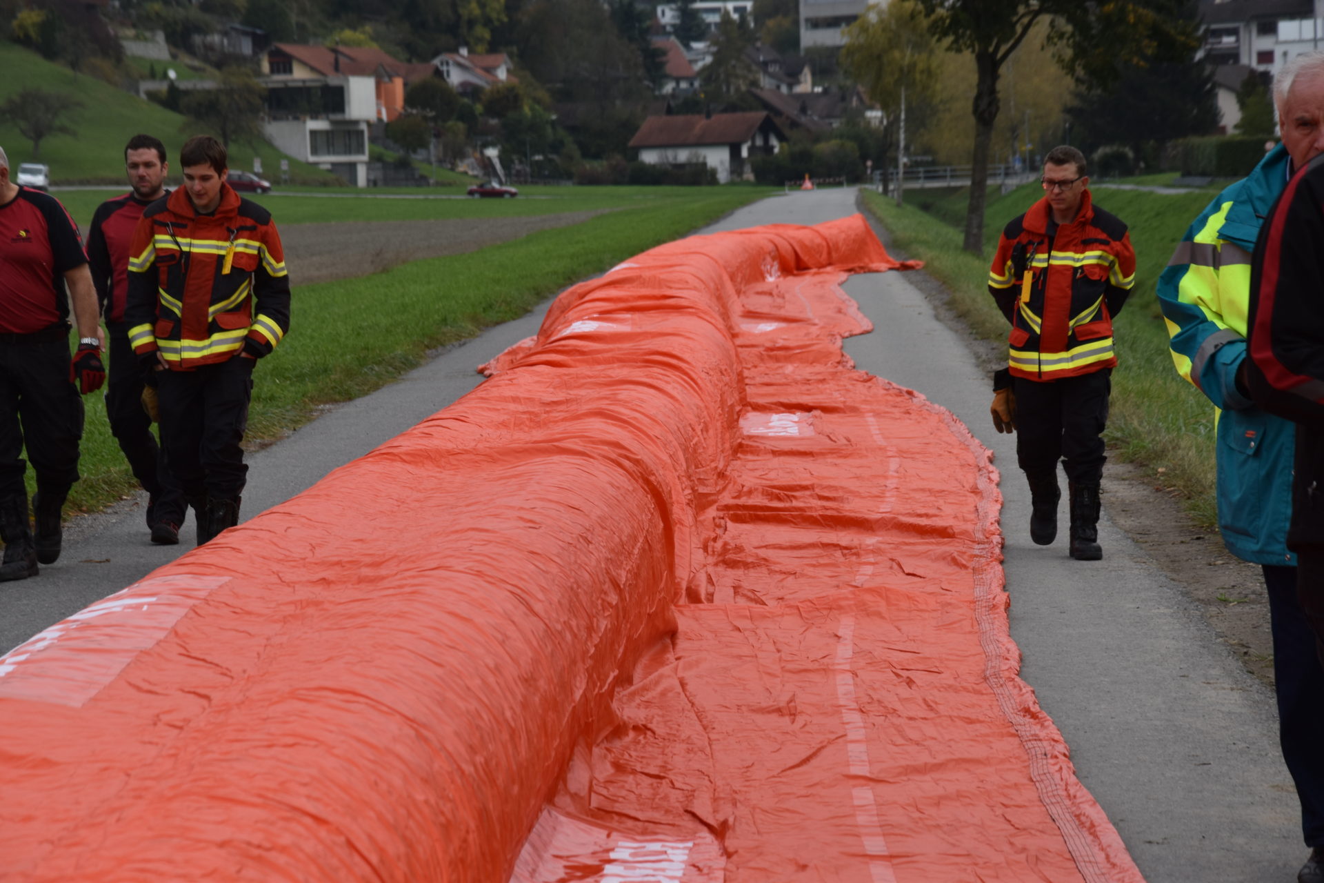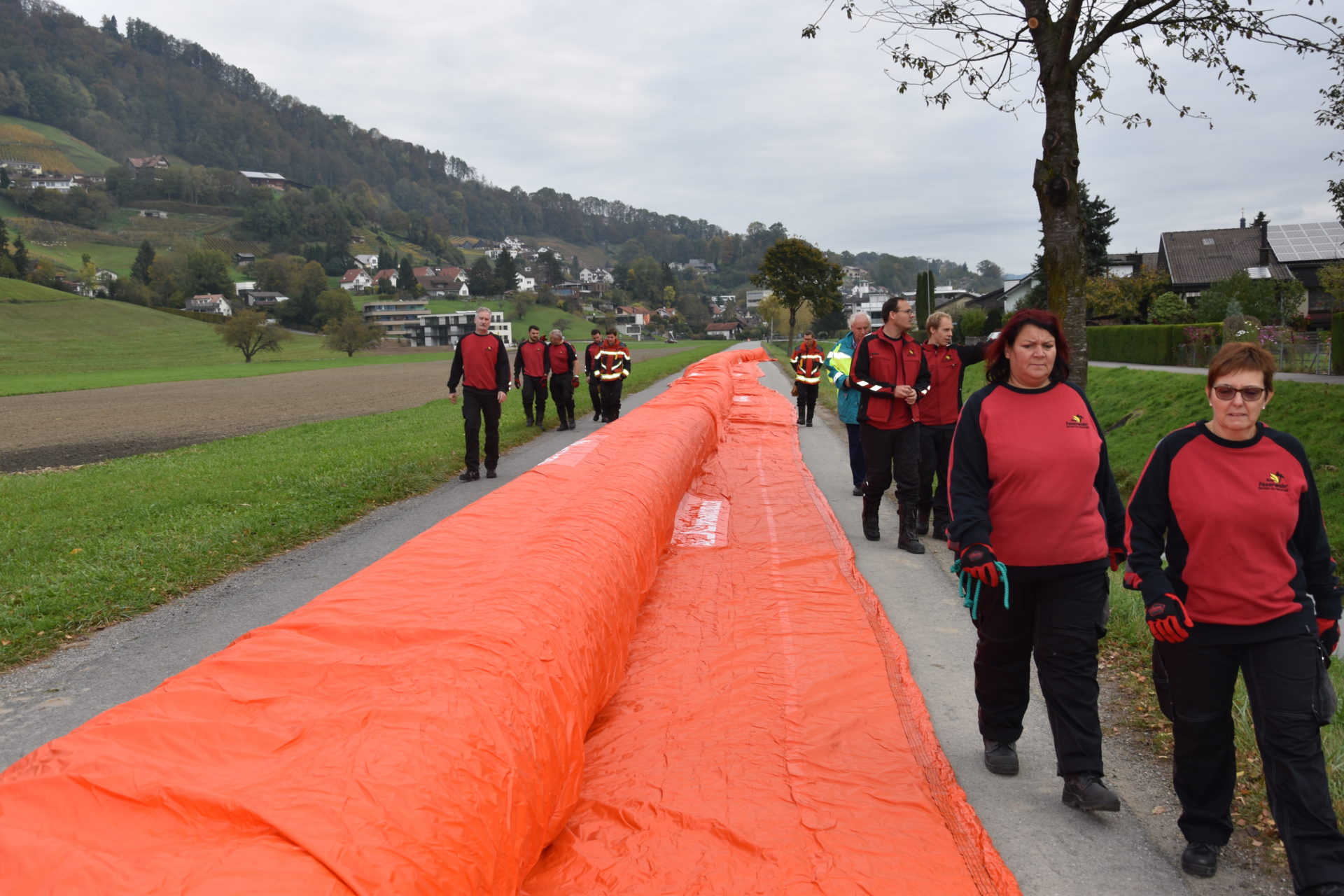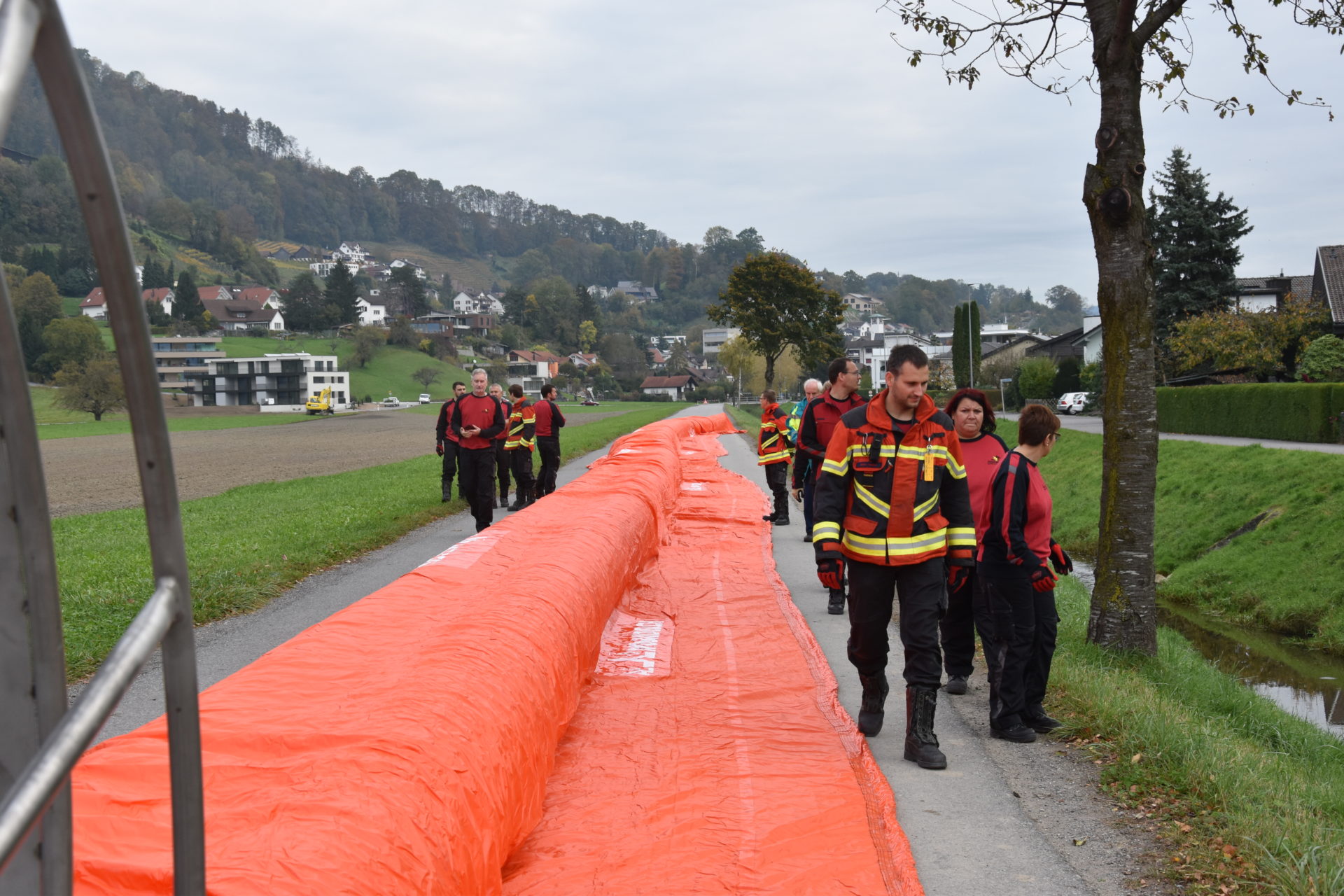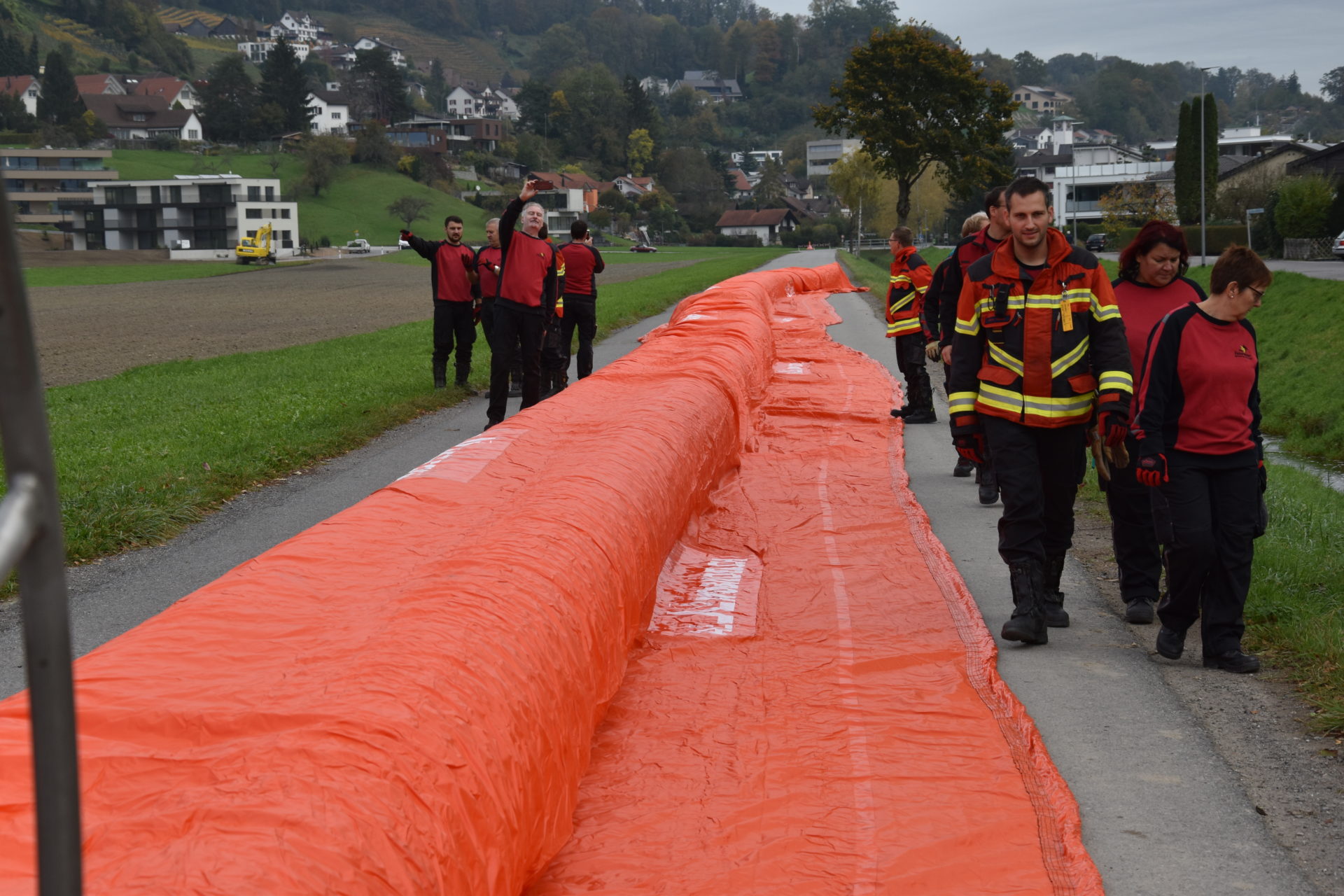 Bei einer Demonstration am Littenbach in Berneck zeigten die Feuerwehrler, wie das System funktioniert. Die Schlauchelemente mit einer Gesamtlänge von 440 Metern werden zwischen zwei grossen Rädern aufgehängt und zum Einsatzort gefahren. Dort werden die Schläuche entrollt und mit Luft oder Wasser vollgepumpt. Innert kürzester Zeit entsteht so ein stabiler Damm von 60 Zentimetern Höhe. «Die Dämme sollen in der ganzen Region zum Einsatz kommen», sagte Feuerwehrkommandant Markus Köppel. Es handle sich um eine Weiterentwicklung des Beaver-Hochwasserschutzsystems. «Es besticht durch eine einfache und schnelle Handhabung», sagte Markus Köppel. Natürlich habe das System auch seine Grenzen. Ziehen Gewitter mit Starkregen ohne Vorwarnung über die Region, können die mobilen Deiche nicht mehr viel ausrichten. Wenn aber hohe Niederschlagsmengen zu erwarten sind, können gefährdete Uferstellen, Häuser und ganze Wohnquartiere rechtzeitig gesichert und dadurch Schäden vermieden werden.