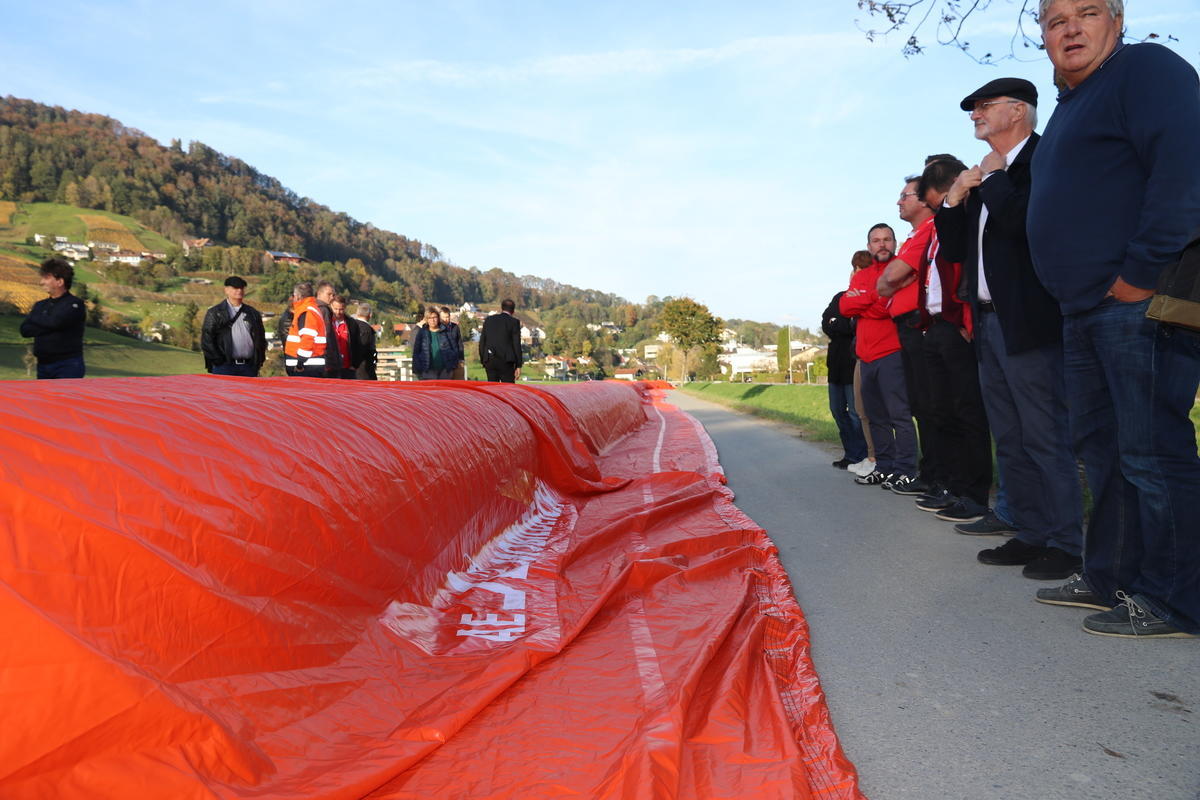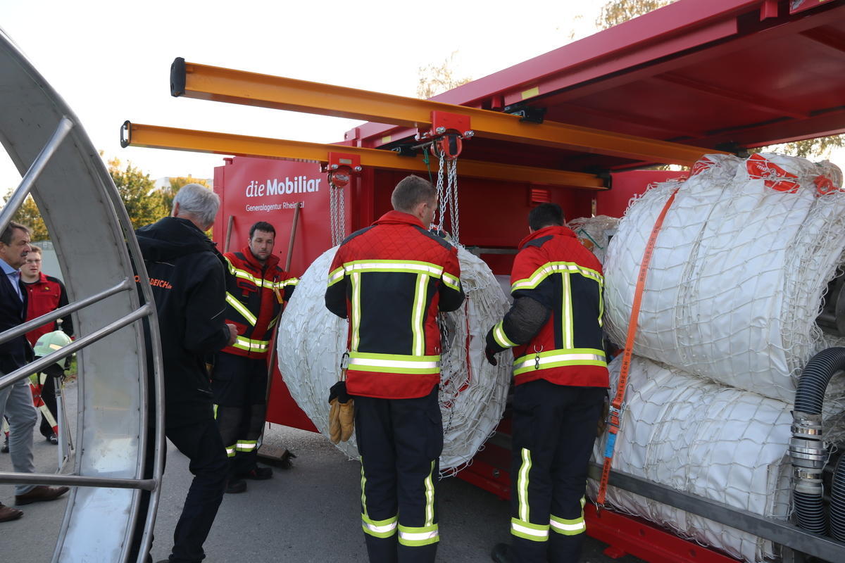 Vorerst müsse man jedoch Erfahrungen sammeln und eruieren, in welchen Gefahrensituationen die Dämme zum Einsatz kommen. Entwickelt hat das einzigartige Containersystem die Aeschlimann Hochwasserschutz AG im luzernischen St. Urban, gemeinsam mit dem deutschen Hersteller Mobildeich. «Mit dem Container ist man schnell am Einsatzort, die Aufstellung der mobilen Deiche ist einfach und geht prompt», sagte Heinz Aeschlimann. Laut Aeschlimann ist es möglich, die Deiche auch bei Bränden einzusetzen, um kontaminiertes Löschwasser aufzufangen.